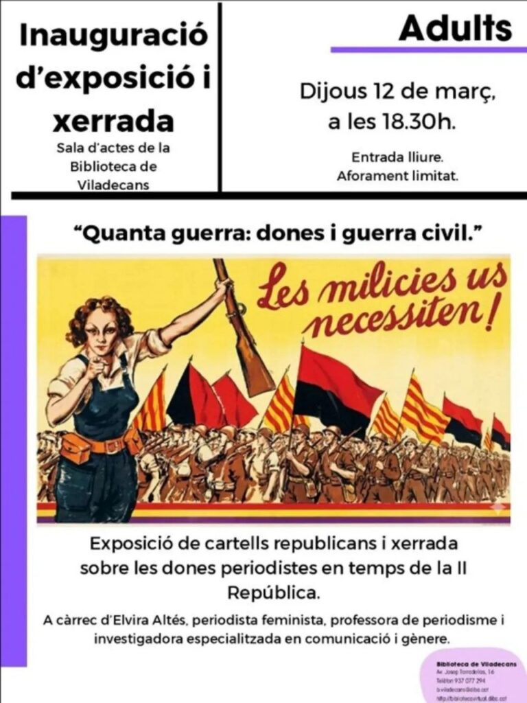 El proper dijous 12 de març a les 18.30 h, a la Sala d’actes de la Biblioteca de Viladecans, l’Elvira Altés participa en la inauguració de l’exposició: «Quanta Guerra: dones i guerra civil», amb una xerrada sobre les dones periodistes en temps de la 2a República.